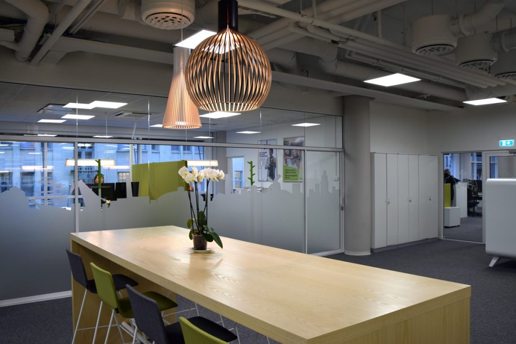 Uusista tiloista haluttiin entistä valoisammat, joten niihin tuli paljon lasipintaa. Ilmettä toimistoon lähdettiin hakemaan teippauksilla, joista vastasi Adworks.
