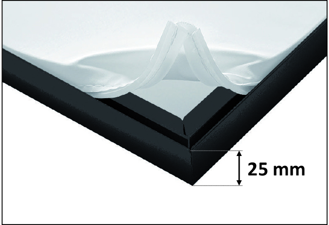 Seinälle kiinnitettävä 1-puolinen musta alumiinirunkoinen kehys kangastulosteella. Alumiiniprofiilin paksuus 25 mm, yhden profiilin maksimipituus 300 cm, profiileja voi kiinnittää useamman toisiinsa, jolloin saadaan isompi kehys. Kangastulosteelle on usea eri materiaalivaihtoehto, mitkä viimeistellään silikonilistalla, jolloin kehykseen pystyy tuottamaan vain uuden kankaan, jos se halutaan uusia. Kehys on tarkoitettu sisätiloissa käytettäväksi.