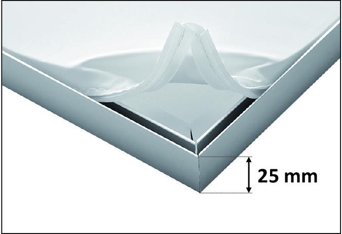 Seinälle kiinnitettävä 1-puolinen alumiinirunkoinen kehys kangastulosteella. Alumiiniprofiilin paksuus 25 mm, yhden profiilin maksimipituus 300 cm, profiileja voi kiinnittää useamman toisiinsa, jolloin saadaan isompi kehys. Kangastulosteelle on usea eri materiaalivaihtoehto, mitkä viimeistellään silikonilistalla, jolloin kehykseen pystyy tuottamaan vain uuden kankaan, jos se halutaan uusia. Kehys on tarkoitettu sisätiloissa käytettäväksi.